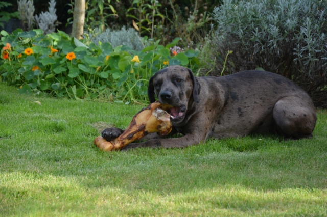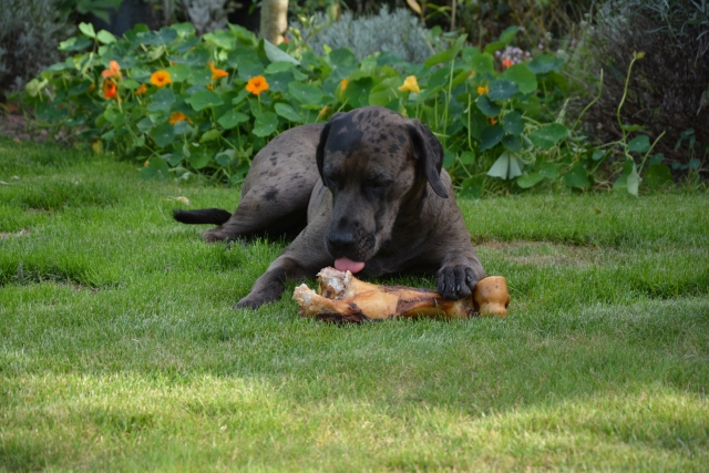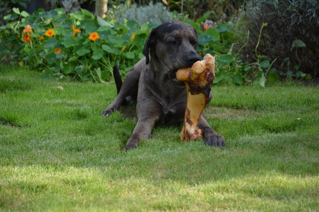 Hier gab es etwas ganz tolles. Einen riesigen Knochen. Der war bestimmt von einem Elefanten oder so etwas ähnlichem. Jedenfalls war er total lecker und ich hätte ihn am liebsten ganz aufgegessen. Aber das durfte ich nicht, weil Herrchen gesagt hat, dass das nicht gut für mich wäre. Schade, aber wahrscheinlich hat Herrchen recht und ich darf bestimmt bald weiter daran rum knabbern. |